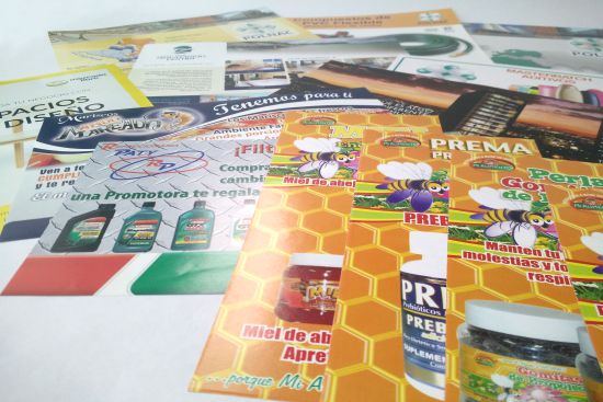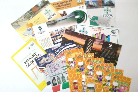 Folletería, volantes por tinta o a color, revistas, calendarios, trípticos, folders, marbetes colgantes para auto, cuadernos, libretas, postales, credenciales en PVC, gafetes,